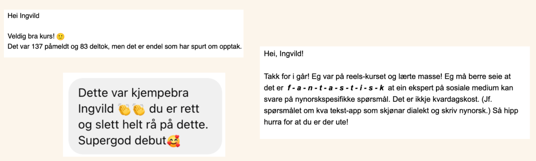 Eg holder kurs i Reels, korleis bruke Instagram smart som bedrift, budskapsspissing, historiefortelling og kan også leigast inn som konsulent eller til å holde foredrag og workshops.